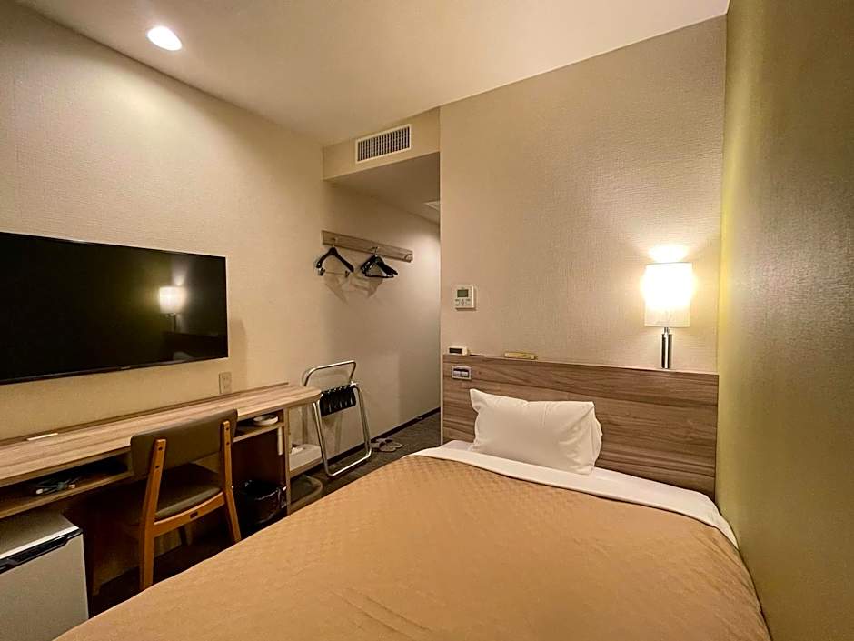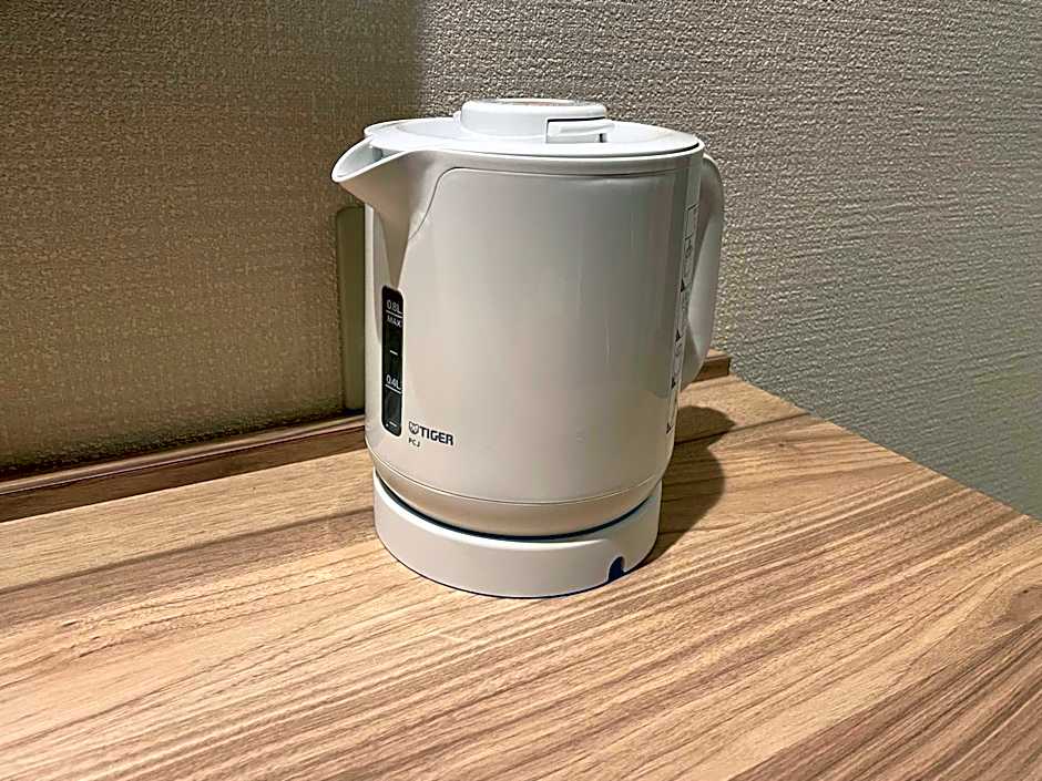 Room features video-on-demand movies and a green-tea maker. The private bathroom includes a hairdryer and amenities.